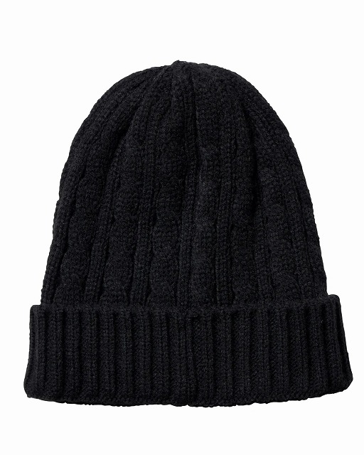 OGロゴのラベルを施したシンプルなケーブル編みのニットキャップ。