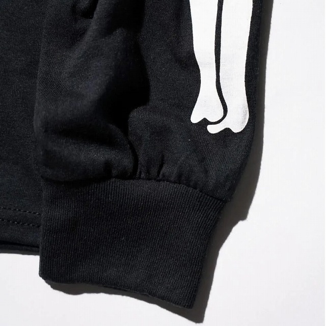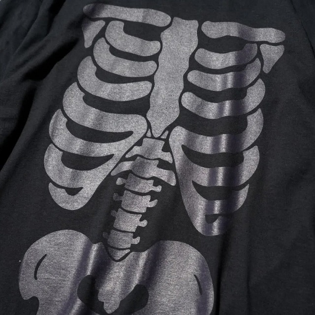 人体の骨をモチーフにしたグラフィックをプリントした長袖Tシャツ。