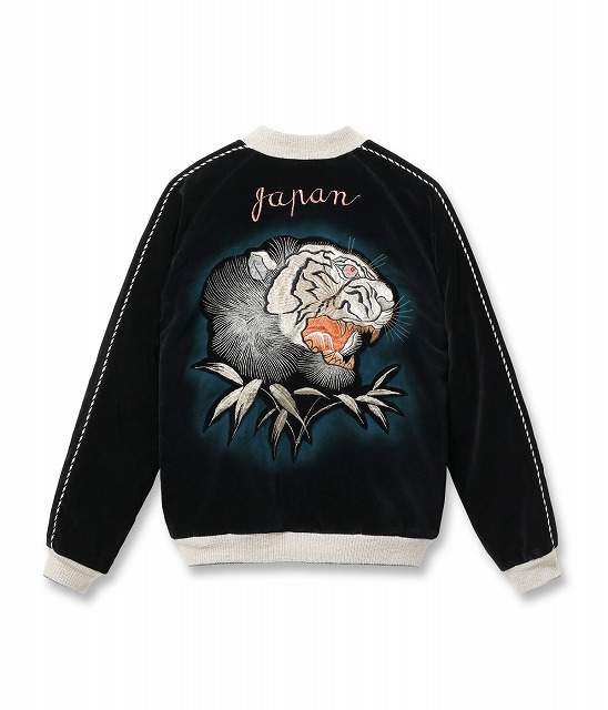東洋エンタープライズの60周年を記念し、ヴィンテージではウルトラレアとされるステンシルが施されたスーベニアジャケットを復刻。当時、スカジャンと同様に横振り刺繍が施されたクッションカバーも米兵の土産物として好まれ、そのバリエーションとして刺繍とステンシルを組み合わせたものが存在する。しかし、ジャケットとして仕立てられたものは極めて珍しく、まさしくスペシャルな一着。刺繍は1950年代中期の「タイガーヘッド」と呼ばれる絵柄で、白虎の顔の周りにはブルーのステンシルが噴かれ、黒い別珍から浮き出てくるかのような迫力。うねる鬣は何度も針足を変えながら一本一本丁寧に描かれ、血走った瞳は赤い刺繍糸で強調されている。
